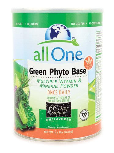 ALL ONE Green Phyto Base is the only nutrient powder available that combines a high potency vitamin and mineral formula with a potent organic blend of greens. Pure, organic juices are extracted, dried and blended to produce an unsurpassed nutritional medium for ALL ONE. These superior nutrient rich plants, representing the very top of the Green Food list, are cultivated organically according to strict O.C.I.A. standards. They are rich in phyto-nutrients, chlorophyll, iron, enzymes, trace minerals, light weight proteins and catalytic enzymes, which work synergistically to permit immediate absorption of the high potency vitamins and minerals in ALL ONE. ALL ONE GREEN PHYTO BASE; vegan, gluten free, dairy free, 2 in 1: Organic Greens plus Vitamins, minerals and Amino Acids.