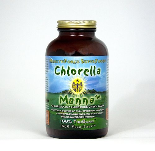 Chlorella Manna by HealthForce Nutritionals 1500 Tablet Chlorella Manna Broken Cell Wall Chlorella Powder Hard-Core Green Algae Incredible source of full spectrum non-toxic absorbable nutrients and compounds including 50-60 Protein. Chlorella is the only plant on the planet that can quadruple its growth in less than one day. It contains Chlorella Growth Factor (CGF) which is a potent phytonutrient comprised of amino acids beta glucans nucleic acids peptides and polysaccharides. These micronutrients work together to help regenerate cells faster than normal - to help your body recover from whatevers ailing you... letting you focus on everything else thats important. Let us focus on your health. -HealthForce 100 Pure Chlorella Tablets (Chlorella pyrenoidosa). Each VeganTab is 200 mg. Grown by TruGanic (beyond organic) standards and carefully dried at low temperatures to retain lifeforce enzymes and other heat-sensitive elements. Suggested Use (as a dietary supplement) 15-25 (or more) tab